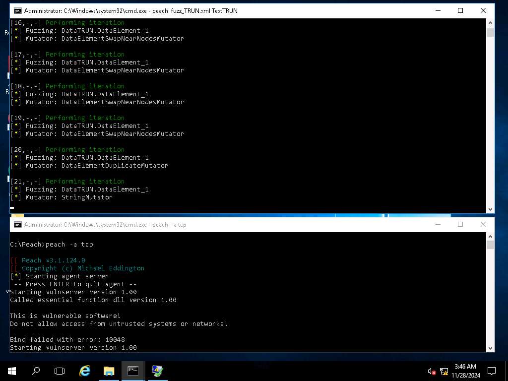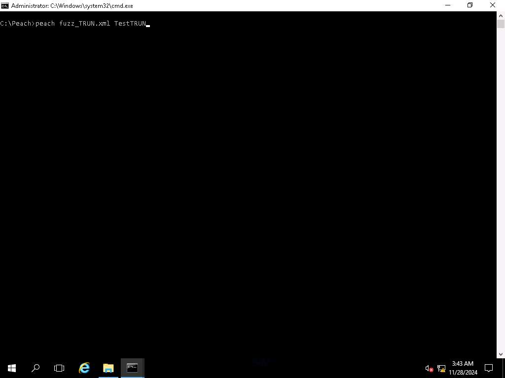 Screenshot Switch to the other Peach terminal, type peach fuzz_TRUN.xml TestTRUN and press Enter.