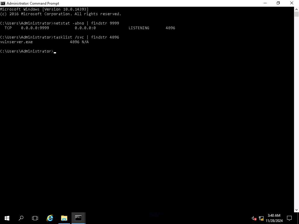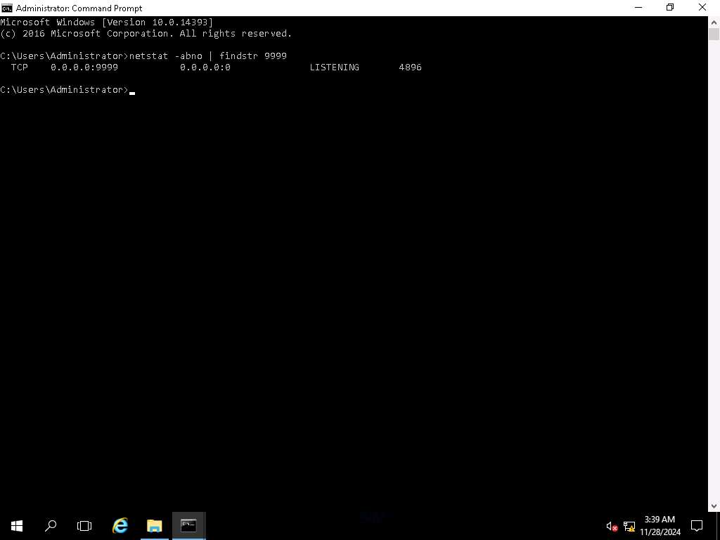 Screenshot To verify that the program is running and has opened a port, open another terminal and type netstat -abno | findstr 9999 and press Enter. Here you need to note down the process ID i.e., 4896. This will differ in your case.