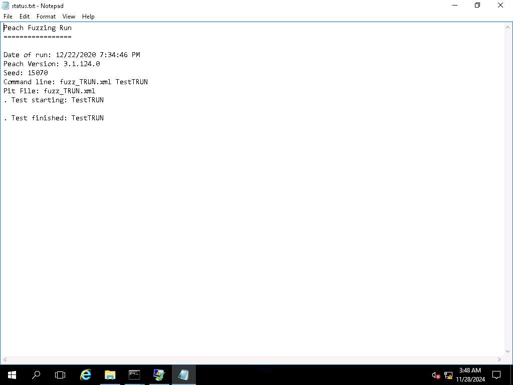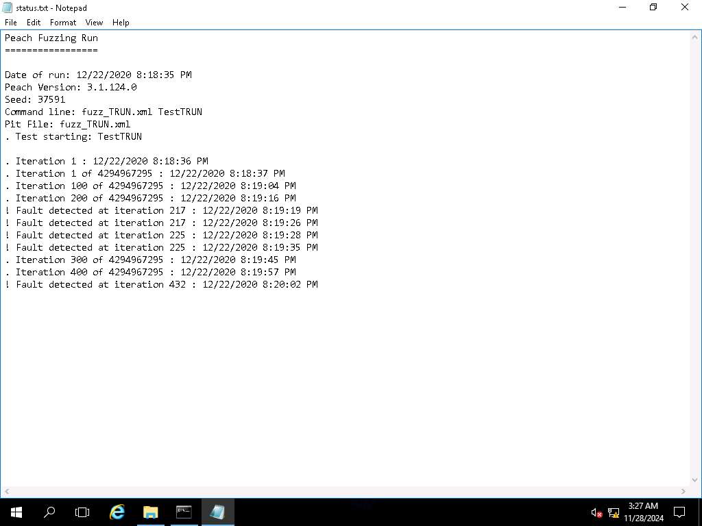 The session can be resumed by skipping the test that has already been performed. Information about which test case was performed last by the fuzzer can be seen in the Logs folder under the session name in file status.txt. An example of this is shown in the screenshot.