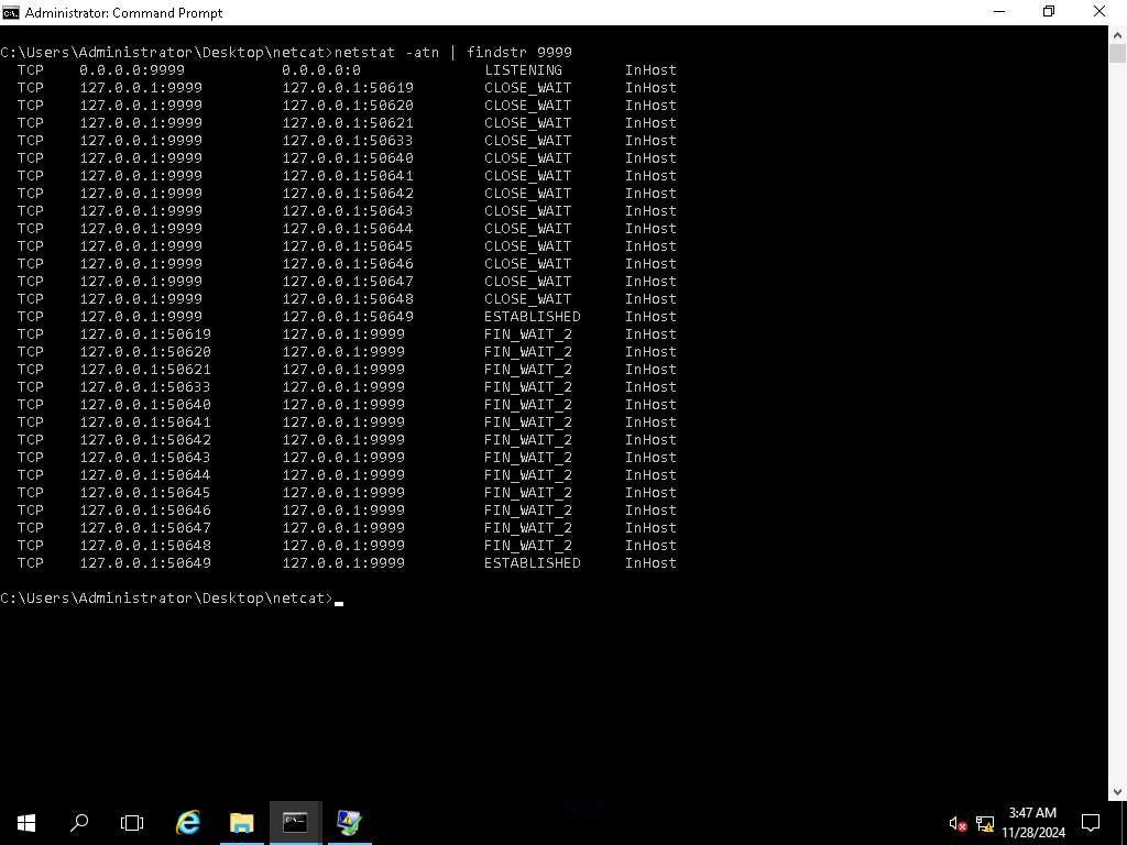 Screenshot To get an idea of what is occurring, in another command prompt, type netstat -atn | findstr 9999 and press Enter.