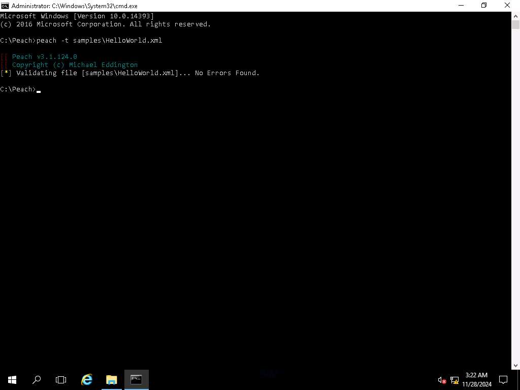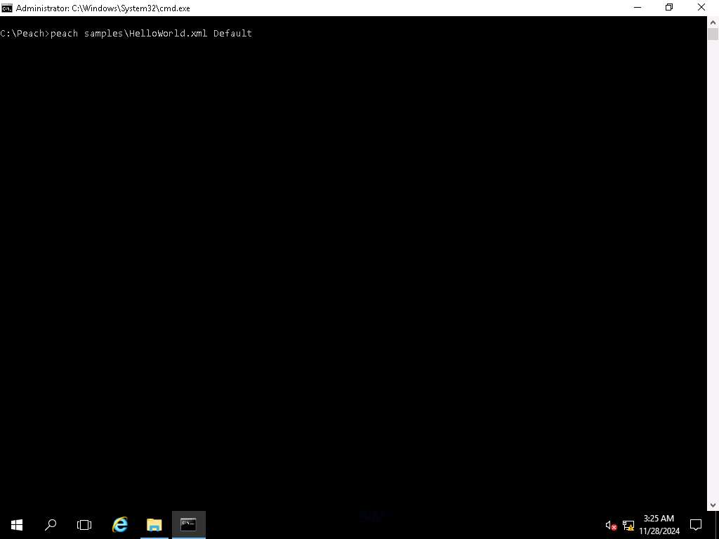 Screenshot In the terminal type peach -t samples\HelloWorld.xml and press Enter. This will validate the file.