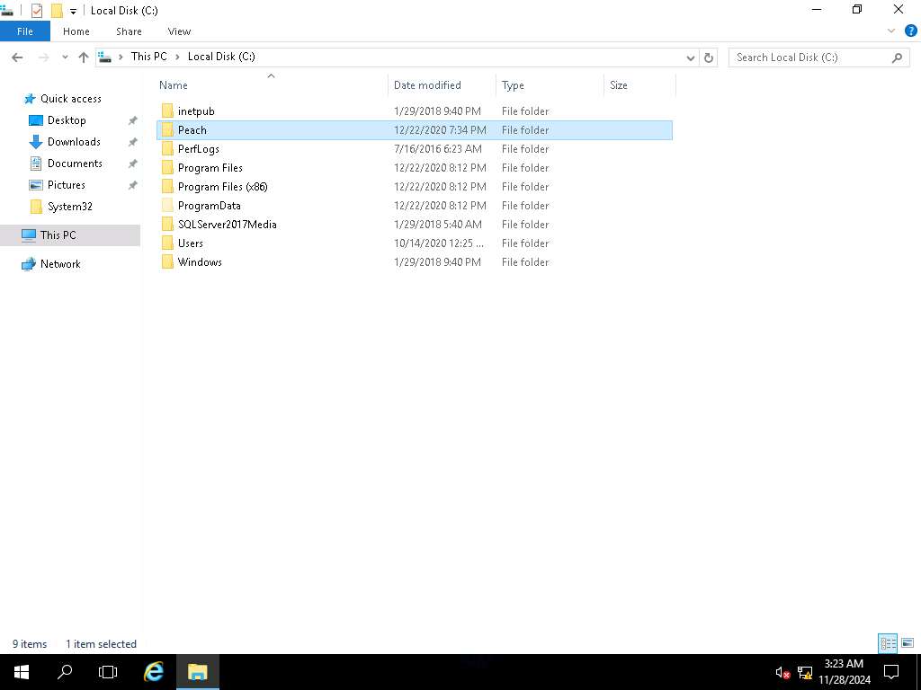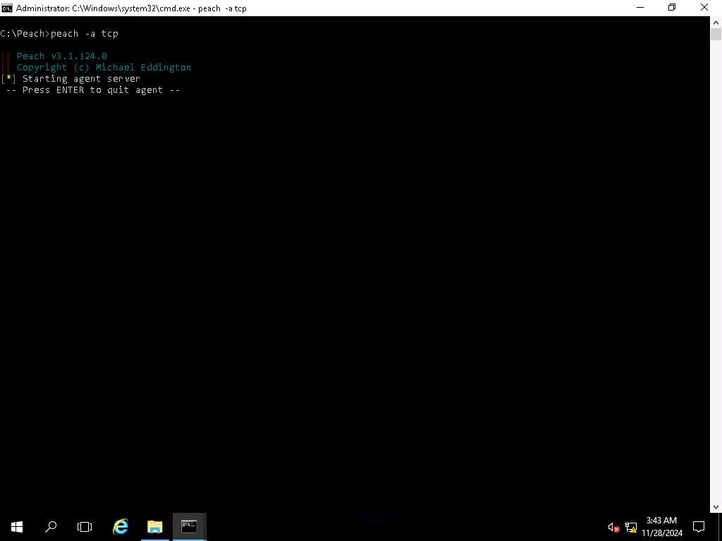 Screenshot Open File Explorer and navigate to C: drive. Now, shift + right-click on Peach folder and click Open command window here from the context menu. In the terminal type peach -a tcp and press Enter. Leave the window running.