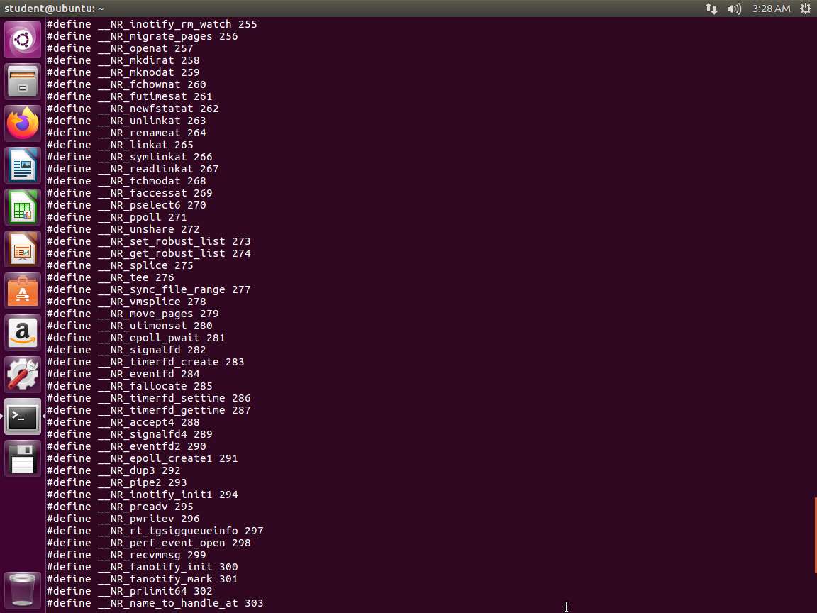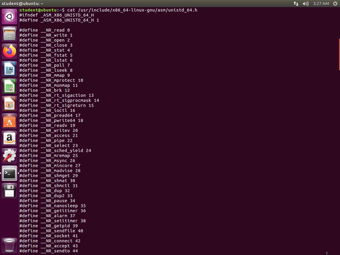 Screenshot Next, enter cat /usr/include/x86_64-linux-gnu/asm/unistd_64.h.