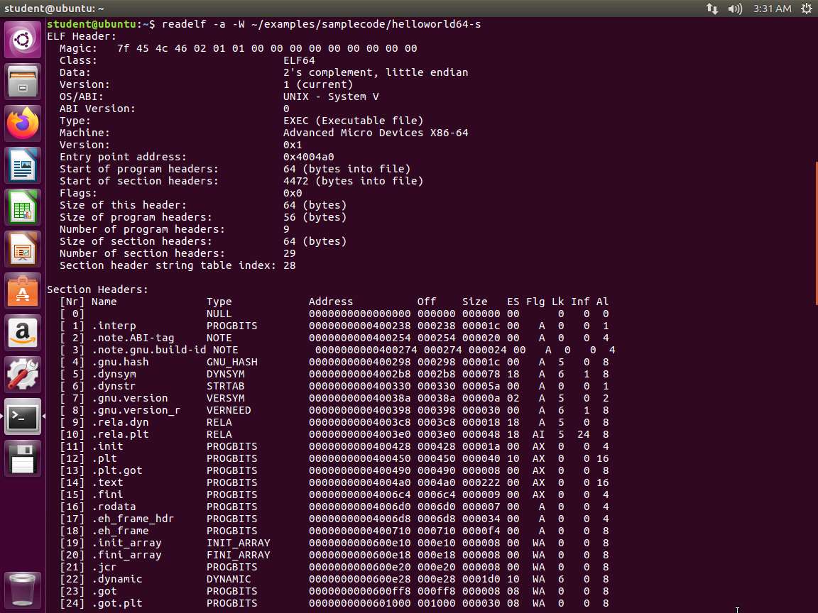 Screenshot The -a argument displays the ELF header, program headers, section headers, symbols, relocations, dynamic section, version information, architecture-specific information, and a histogram of bucket list lengths. We can also see that we are dealing with an executable file as opposed to a relocatable object file and the address in memory where execution begins is 0x400a0. There are nine program headers, each of which is 56 bytes in size, and thirty-one section headers, each of which is 64 bytes in size.