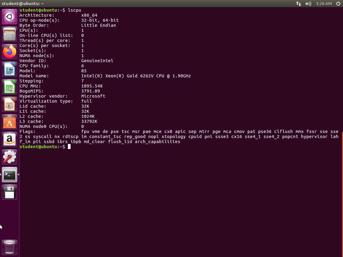 Screenshot As the screenshot in Step 2 shows, we have additional registers along with the 64-bit version of the registers we have already discussed. Next, enter lscpu. The output of this command is shown in the following screenshot.