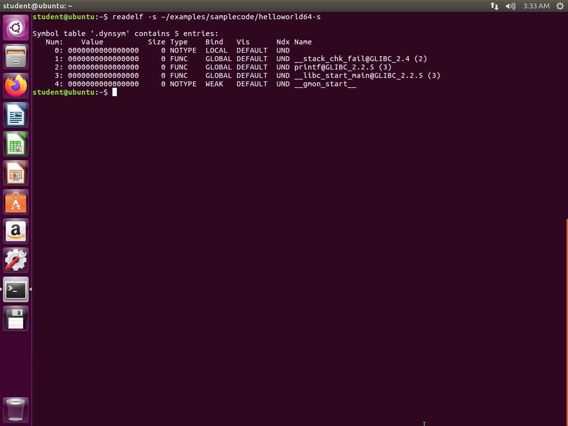 Next, enter readelf -s ~/examples/samplecode/helloworld64-s. The output of the symbol table is shown in the following screenshot.
