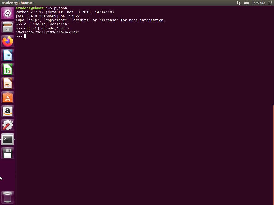 Screenshot Once the Python prompt is available, we initialize a variable called c and store the string as Hello, World!\n. Next, we use Python's power of string manipulation, and in one line, reverse the order of the characters in the string with the c[::-1] syntax. Then, we call the encode method to encode our characters in their hexadecimal representation. This is done with the .encode('hex') part of the syntax. This makes our string almost usable for assembly.
