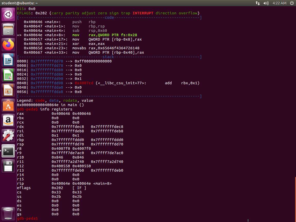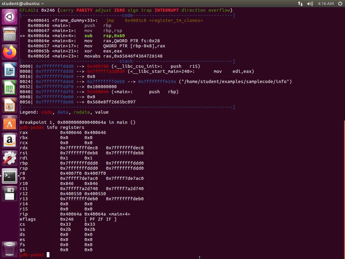 Screenshot Now, we are ready to view the contents of the registers. Enter info registers.