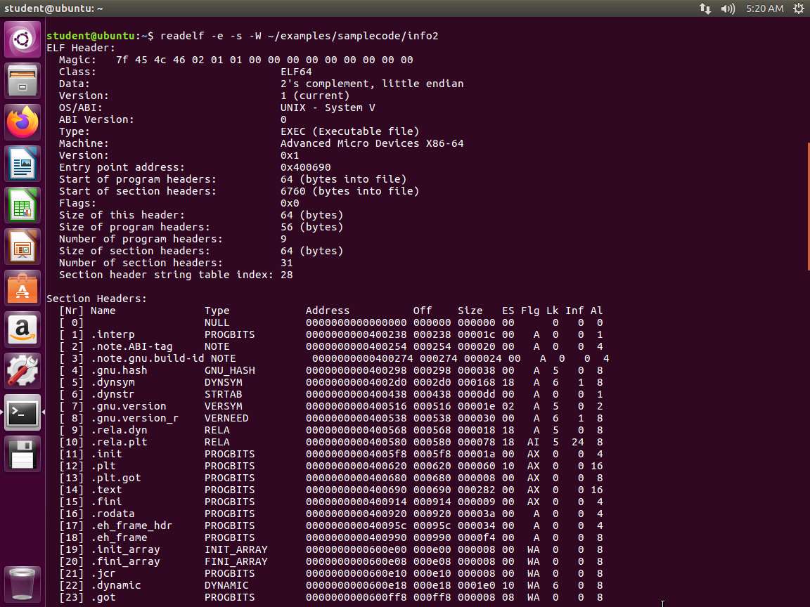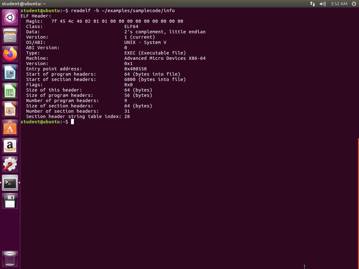 Next, we will return to our readelf command. Enter readelf -h ~/examples/samplecode/info.
