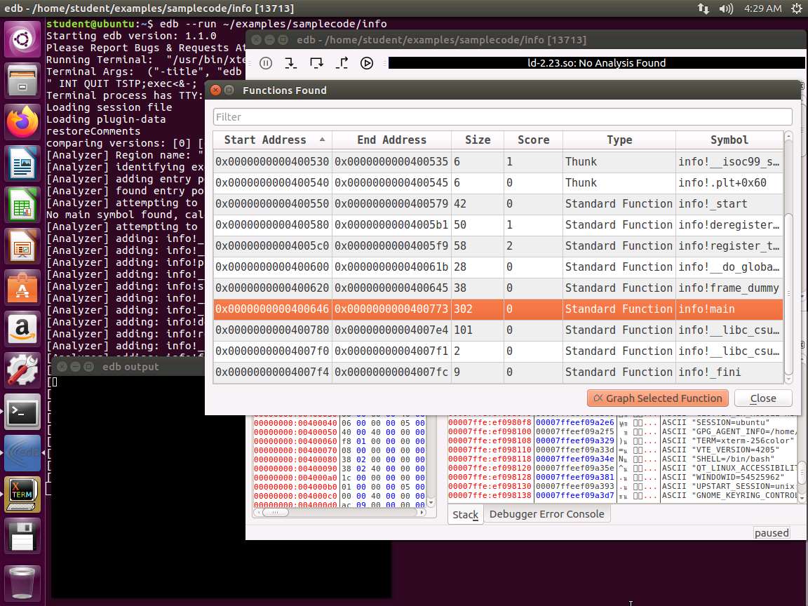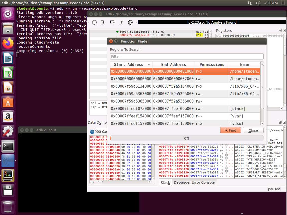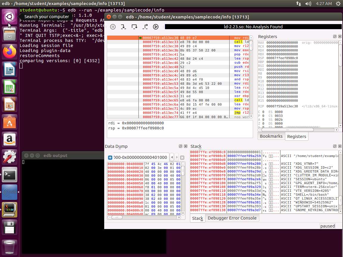 Screenshot We are now ready to move to the next step. Enter quit. This will exit the debugger. We will try another. Enter edb --run ~/examples/samplecode/info. This will launch Evans Debugger as shown in the following screenshot.