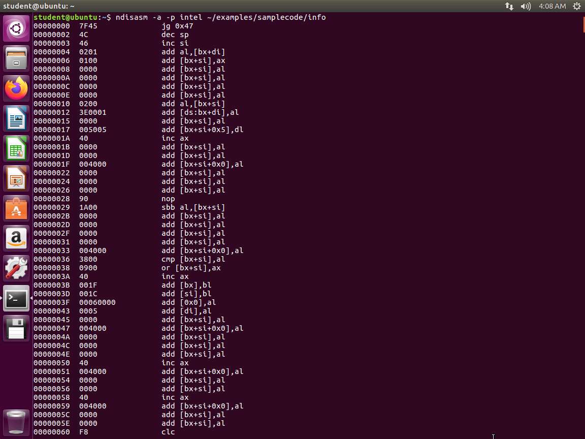 The next tool we will use is the Netwide Disassembler. In the terminal window, enter ndisasm -a -p intel ~/examples/samplecode/info. An example of the command output is shown in the following screenshot.