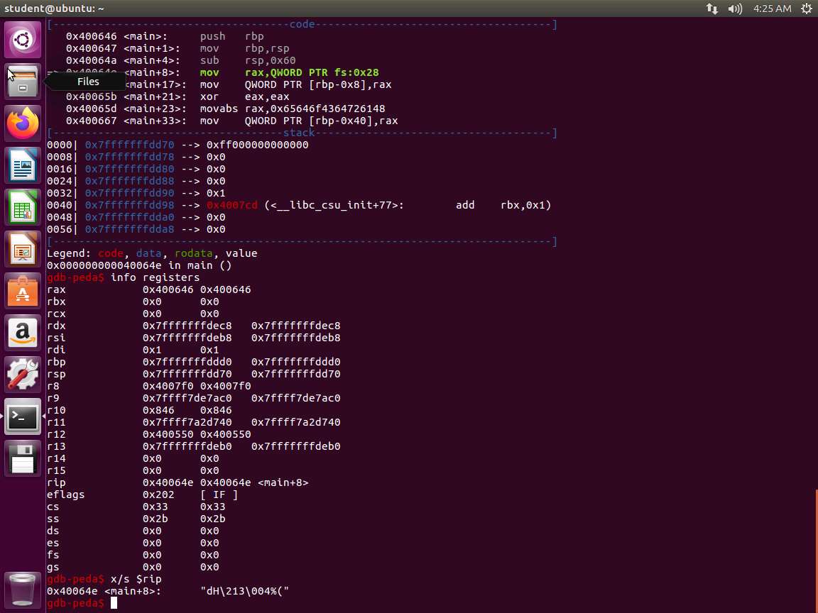 Screenshot Enter the x/s $rip command, if you are using the 64-bit system. Essentially, this final command tells GDB we want to examine the RIP register and display the output as a string.