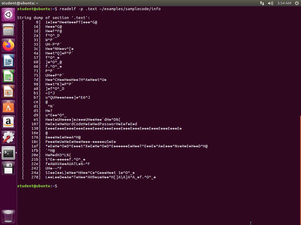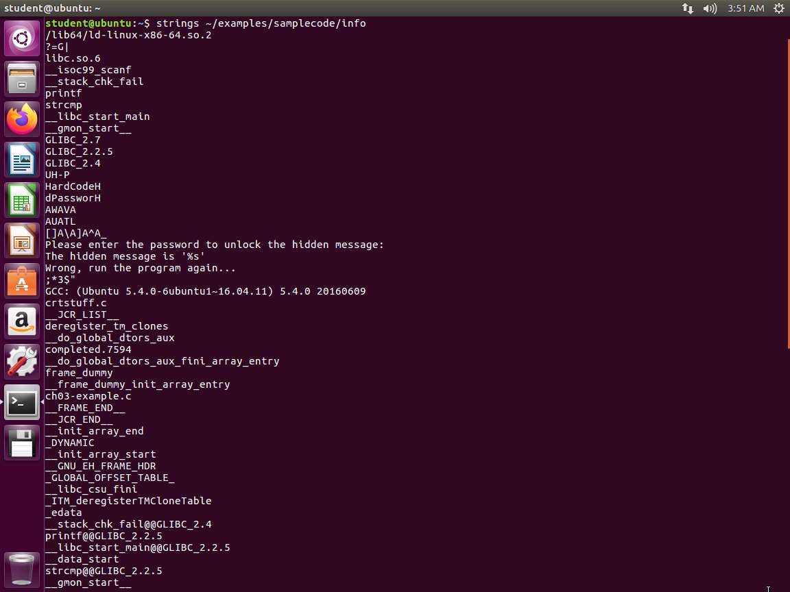 Next, in the terminal window, enter strings ~/examples/samplecode/info. The output of the command is shown in the following screenshot.