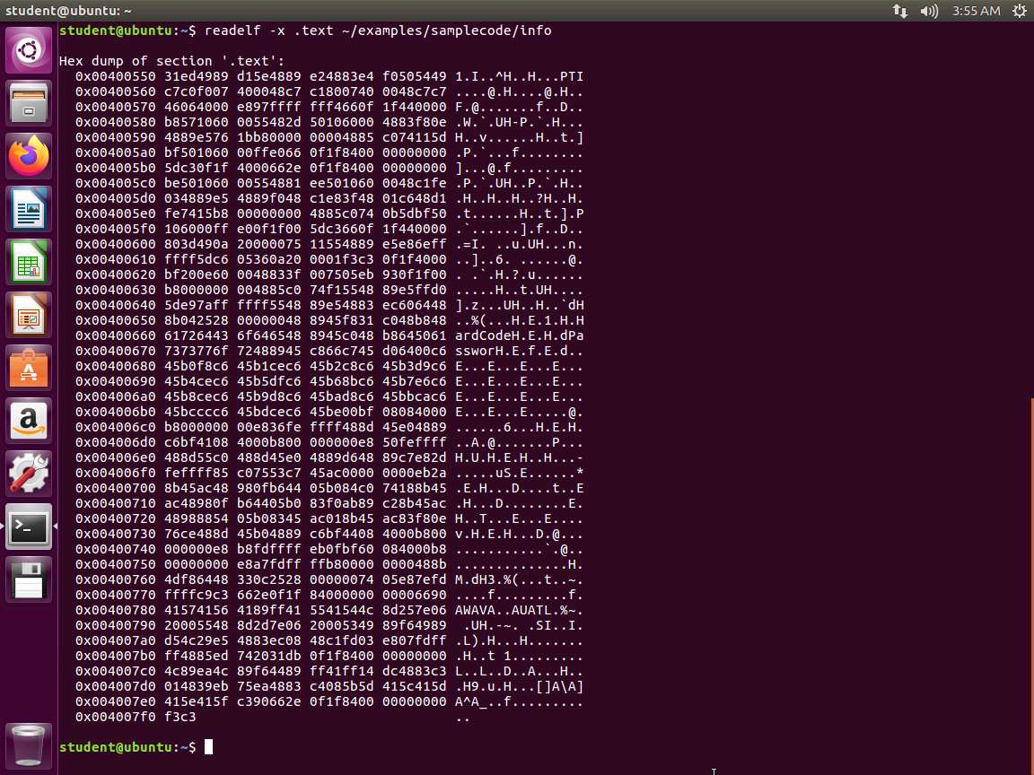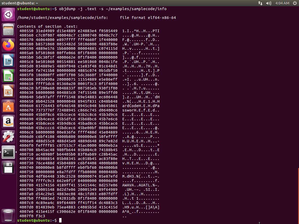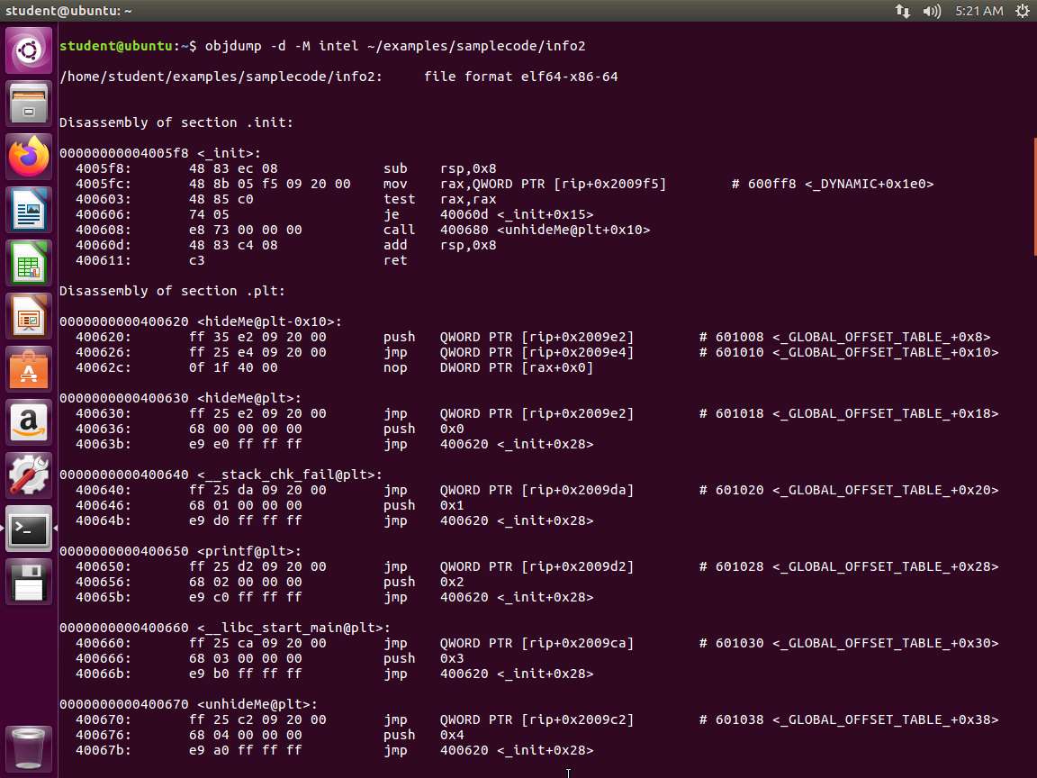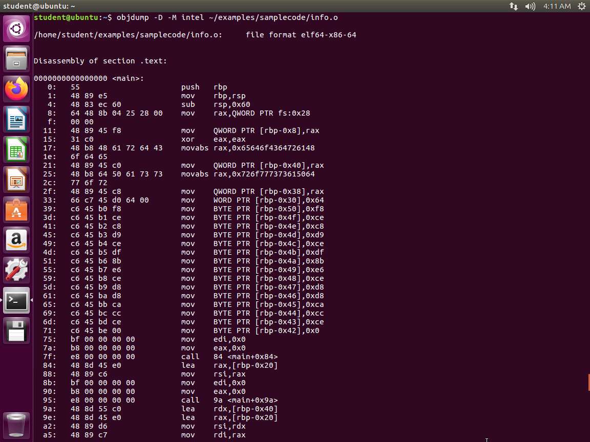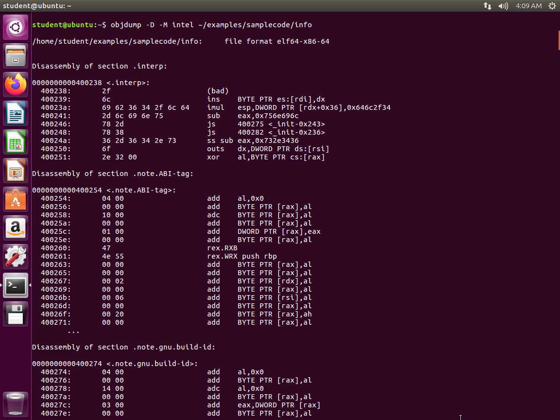 Screenshot The next command to enter is objdump -D -M intel ~/examples/samplecode/info. An example of the command output is shown in the following screenshot.