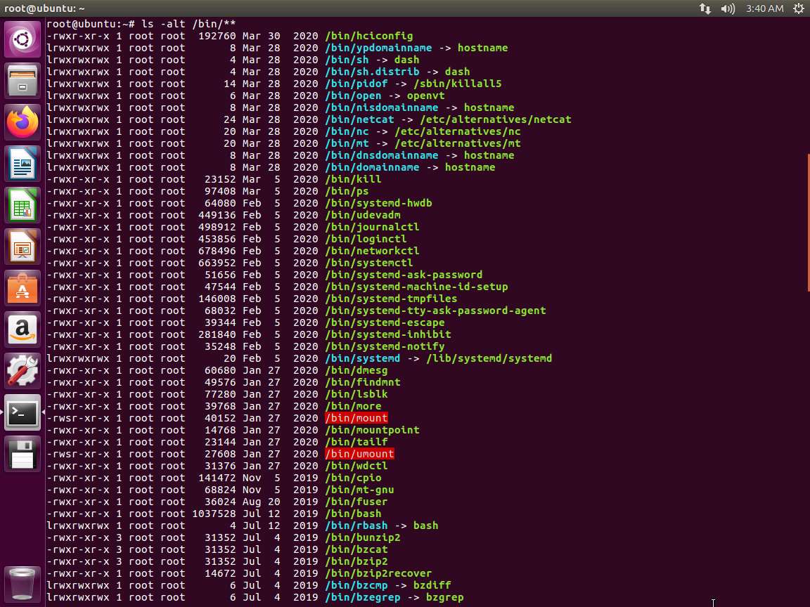 Screenshot Next, enter ls -alt /bin/. The output of the command is shown in the following screenshot.