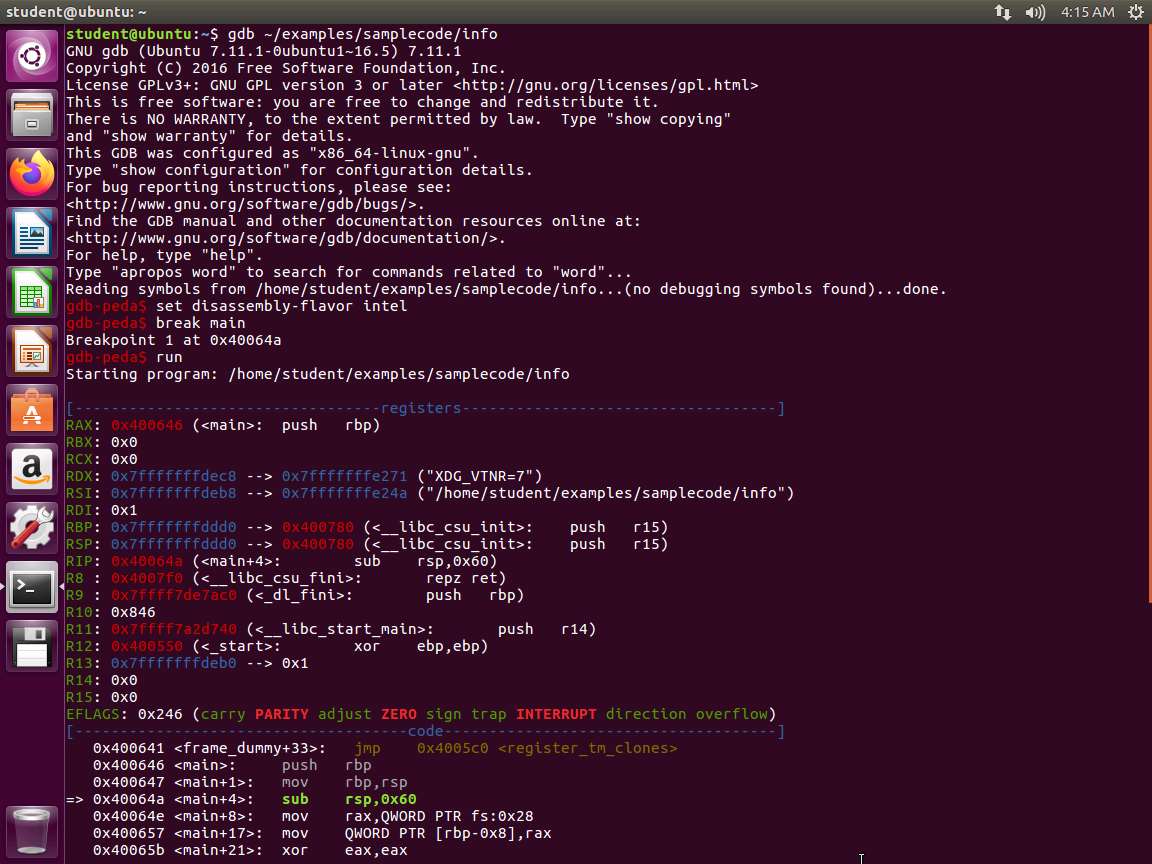 a. gdb ~/examples/samplecode/info