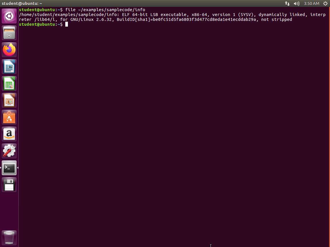 Screenshot We can see that this is a 64-bit executable and linking format (ELF) formatted executable binary that contains its symbol table (because it is not stripped in our output). The file command is a great way to start because it gives us quick yet detailed information about the format of the binary and other pertinent information such as the architecture, whether we are dealing with an executable or a relocatable object file, the binary hash, and whether or not the binary has been stripped of its symbol table or not. The output of the file command is largely dependent upon the options used when the binary was compiled.