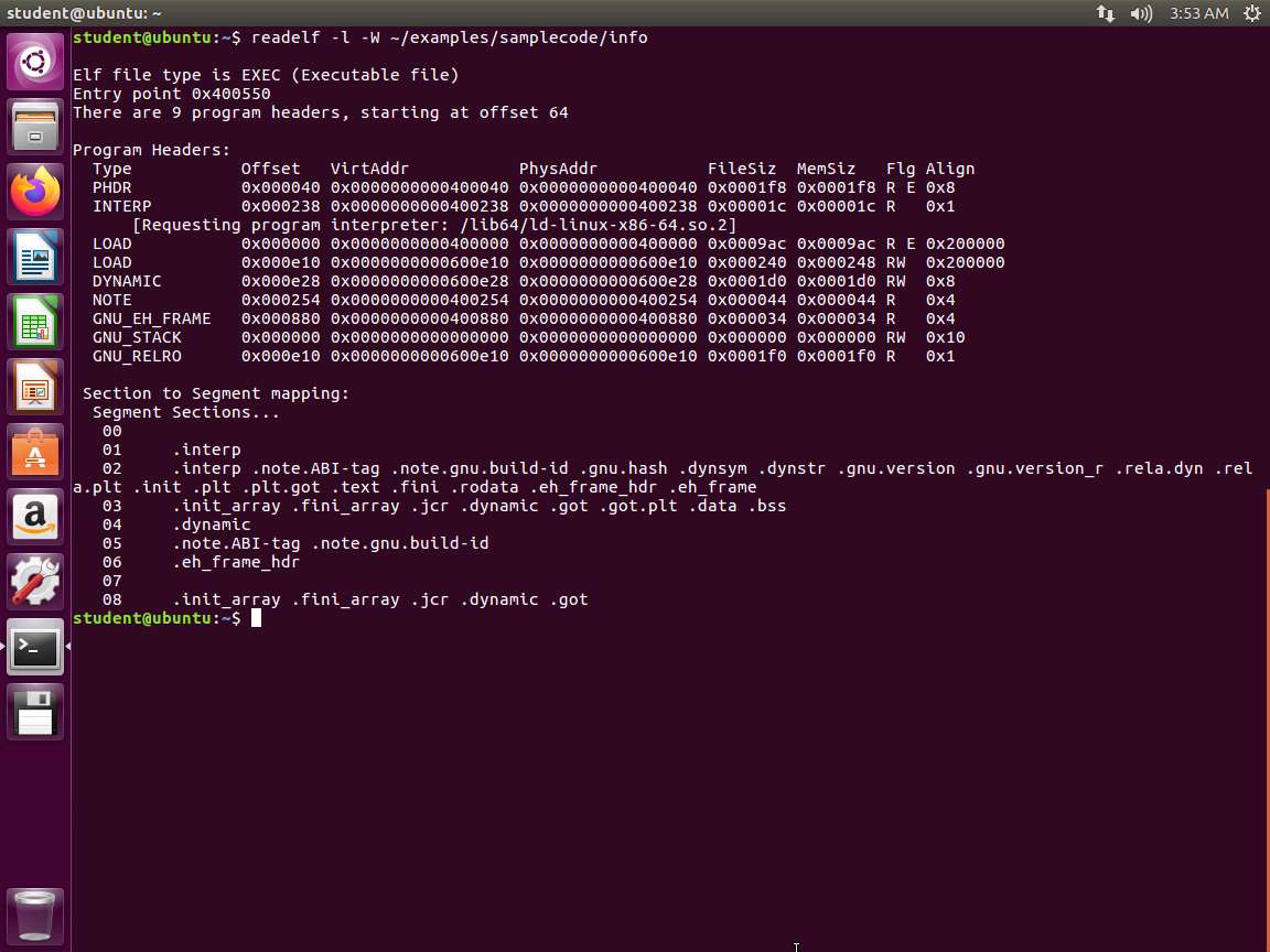 Next, enter readelf -l -W ~/examples/samplecode/info. The output of the command is shown in the following screenshot.