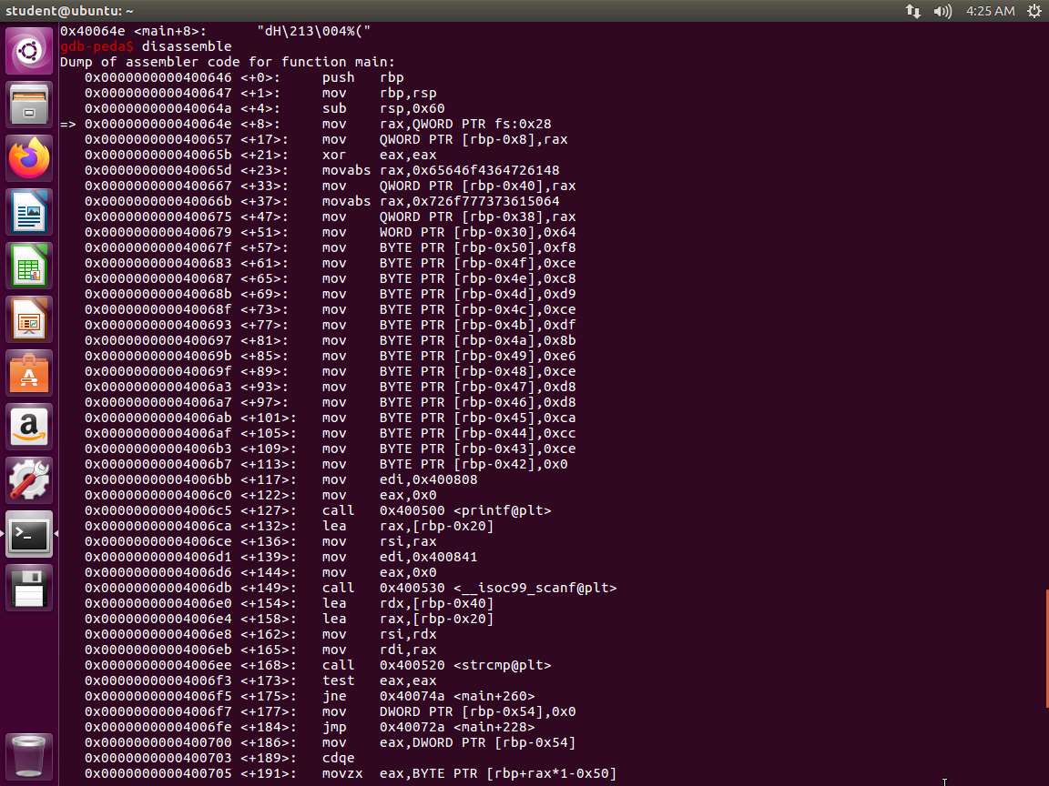 You will also notice the use of scanf, printf, and strcmp near the beginning of the output. For those familiar with C programming, printf is used to display output to stdout, scanf is used to take input from stdin, and strcmp is used to compare two strings. Therefore, what this tells us is that this program uses these functions in some way. Based on the hardcoded password and the sentence requesting the password, you could make some assumptions about the program; however, it is much safer to be certain than to assume anything from the output.