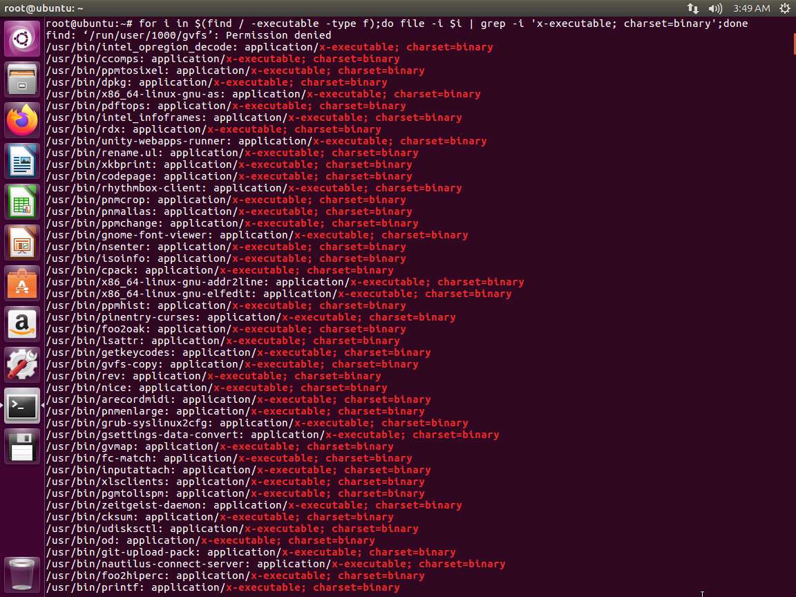In the terminal window, enter for i in $(find / -executable -type f);do file -i $i | grep -i 'x-executable; charset=binary';done. An example of the output is shown in the following screenshot.