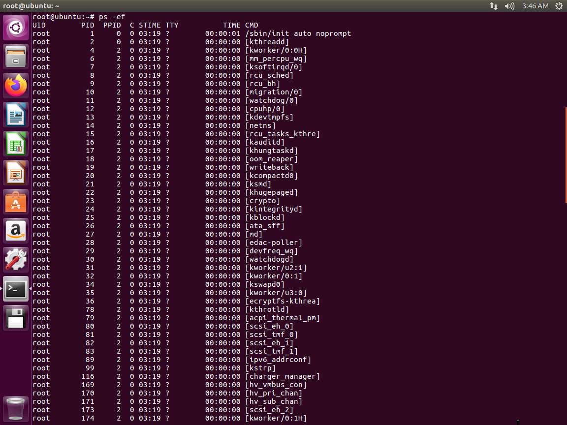 In the terminal window, enter ps -ef. An example of the command output is shown in the following screenshot.