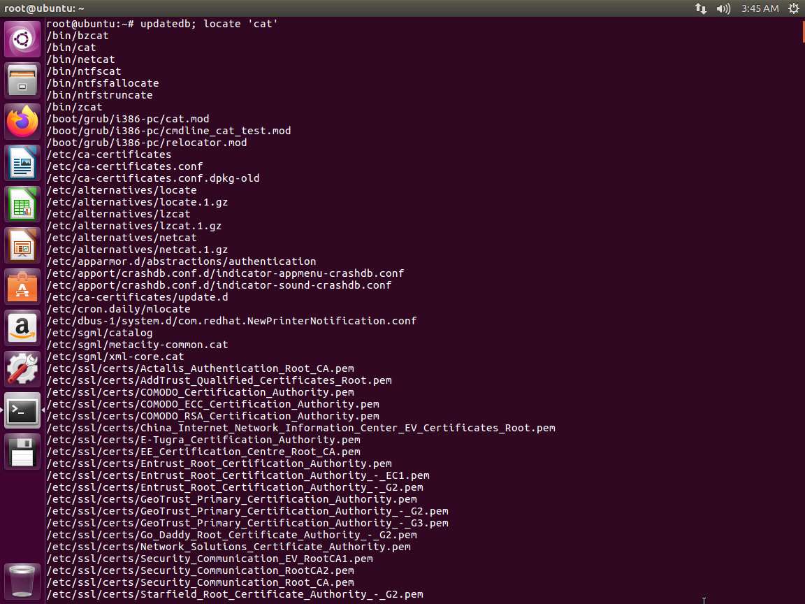 Next, in the terminal window, enter updatedb; locate 'cat'. The output of this command is shown in the following screenshot.
