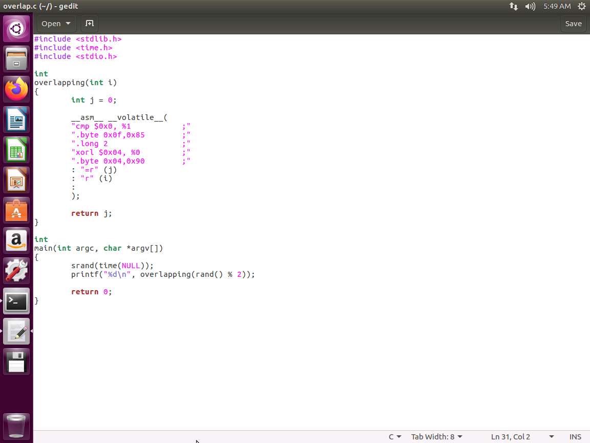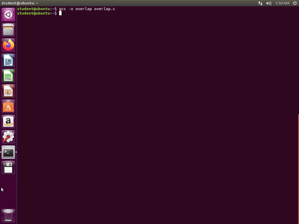 Once you have created and saved the file, compile it by entering gcc -o overlap overlap.c.