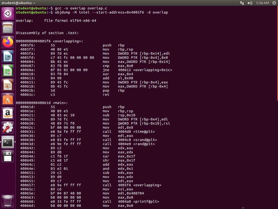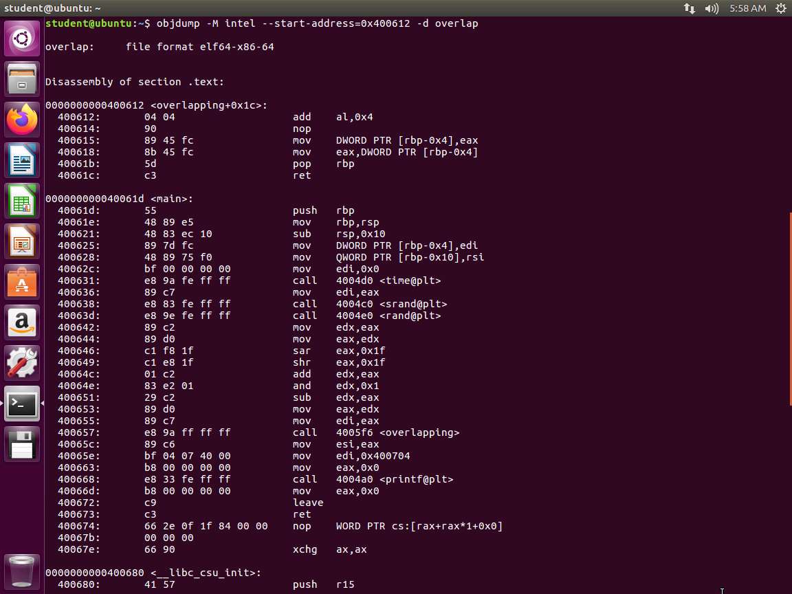 Enter objdump -M intel --start-address=0x4005f6 -d overlap. The output of the command is shown in the following screenshot.