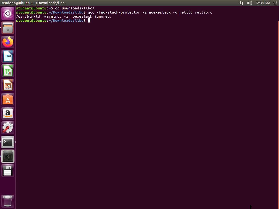 We want to compile the code. Enter cd Downloads/libc and then Enter gcc -fno-stack-protector -z noexecstack -o retlib retlib.c.