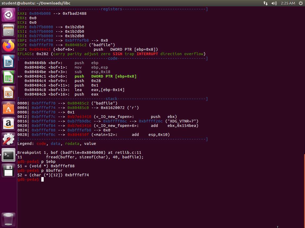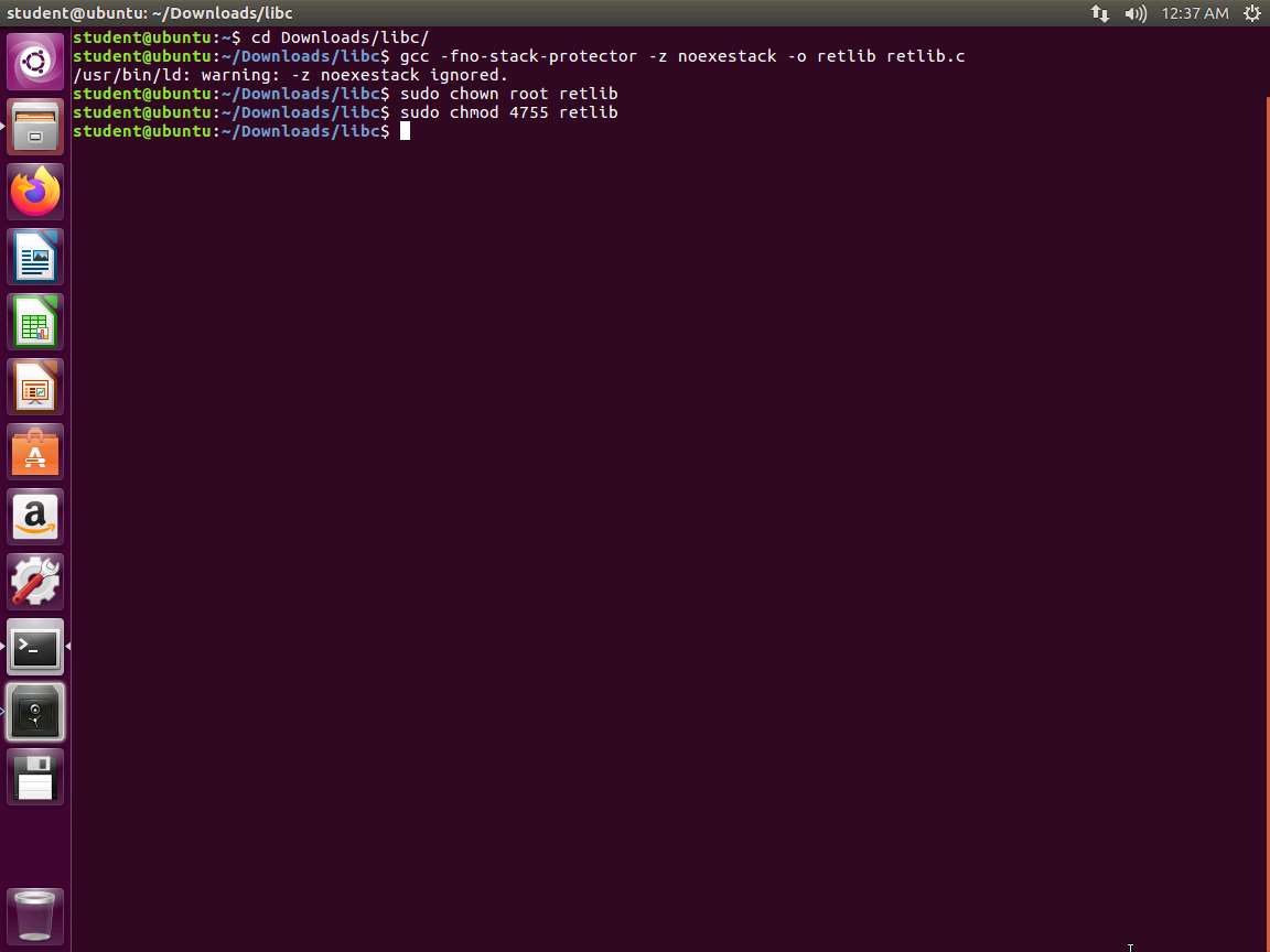 It is now time for debugging. Exit your editor, and enter gcc -fno-stack-protector -z noexecstack -g -o retlib_gdb retlib.c.