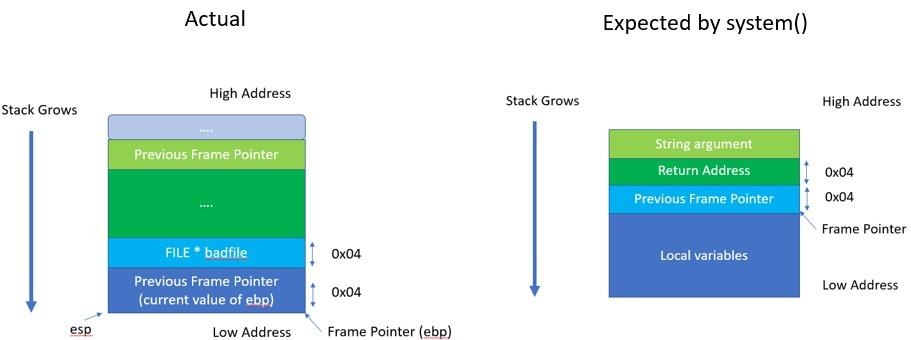 30g24l7s.jpg As you review the above screenshot, note that the system() would find the address of its string argument 0x08 bytes above the ebp. This is shown in "Expected by system()".