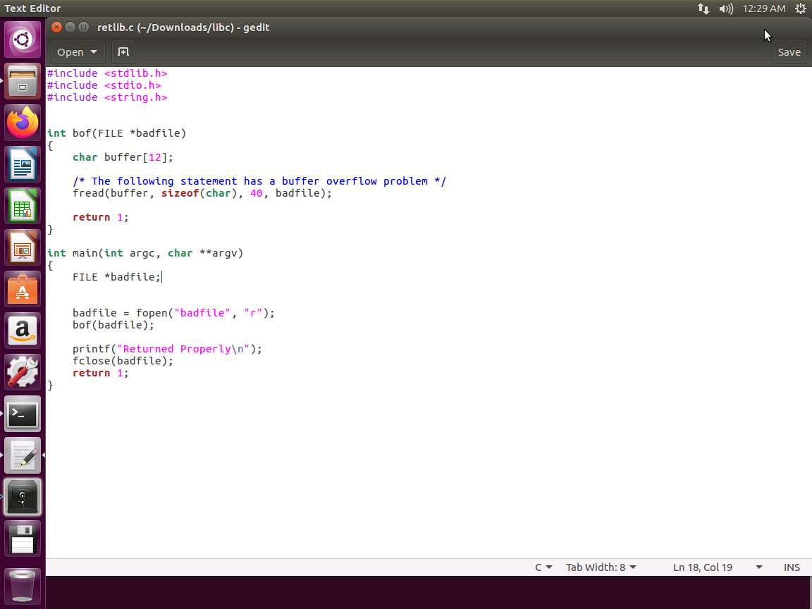 Screenshot Now that we have turned the ASLR off, we can examine the sample code. The code we first want to look at is found in the retlib.c file. Open it in your preferred editor and review. An example of the code is shown in the following screenshot.