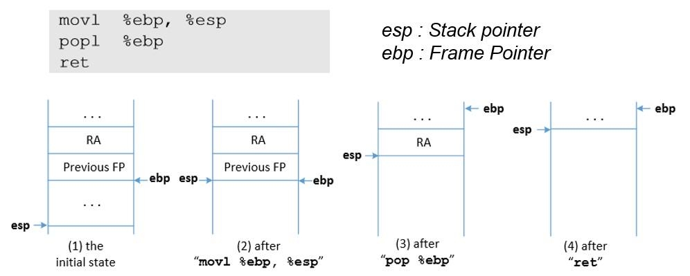 6yopxaqx.jpg The stack pointer now points to where the frame pointer points in order to release the stack space allocated for the local variables.