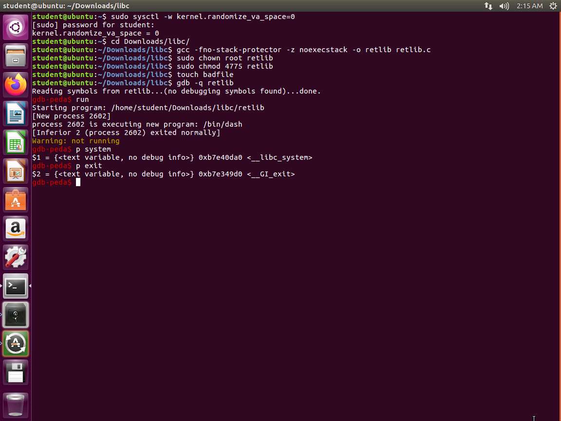 Screenshot Our first task is to find the address of the libc function. In Linux, when a program runs, the libc library will be loaded into memory. When the memory address randomization is turned off, for the same program, the library is always loaded in the same memory address (for different programs, the memory addresses of the libc library may be different). Therefore, we can easily find out the address of system() using a debugging tool such as gdb. We can debug the target program retlib. Even though the program is a root-owned Set-UID program, we can still debug it, except that the privilege will be dropped (i.e., the effective user ID will be the same as the real user ID). Inside gdb, we need to type the run command to execute the target program once; otherwise, the library code will not be loaded. We use the p command (or print) to print out the address of the system() and exit() functions (we will need exit() later on).