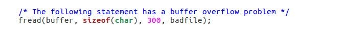Screenshot As you can see in the above screenshot, there is a buffer overflow problem in this code. It first reads an input of size 300 bytes from a file called badfile. It then copies this into a buffer of 12 bytes, so 300 into 12 is not going to work well. The code will be set to a set-UID program, so a normal user who is exploiting it can obtain root privileges. Again, we are going to use badfile to create our shell code, and then copy it to our 12-byte buffer.