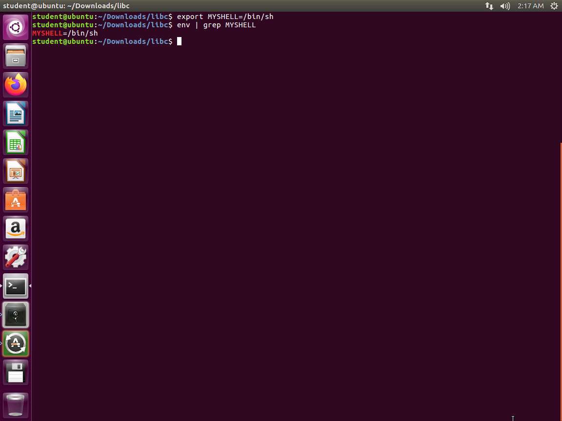 TypeCopyexport MYSHELL=/bin/sh env | grep MYSHELLAn example of the output of these commands is shown in the following screenshot.