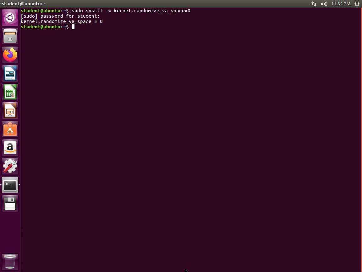 As we have done earlier, we first verify that the Address Space Layout Randomization (ASLR) is off, because as you saw earlier, this will complicate the process. In the terminal window, enter sysctl kernel.randomize_va_space. This should be set to 0. If it is not, then enter sudo sysctl kernel.randomize_va_space=0.