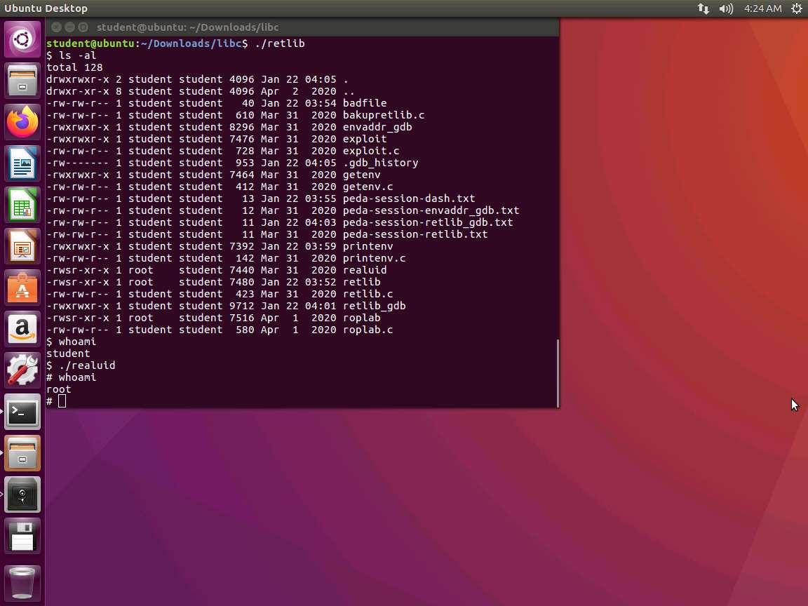 Screenshot Once the code compiles, we want to set the set-UID bit. Enter sudo chown root retlib and then sudo chmod 4755 retlib.