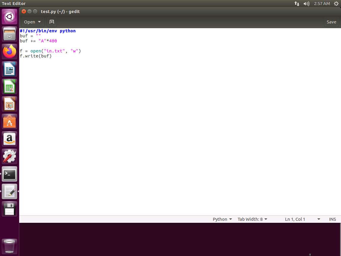 Screenshot TypeCopy#!/usr/bin/env python buf = "" buf += "A"*400 f = open("in.txt", "w") f.write(buf)