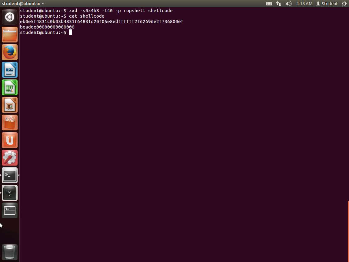 a. xxd -s0x4b8 -l40 -p ropshell shellcode