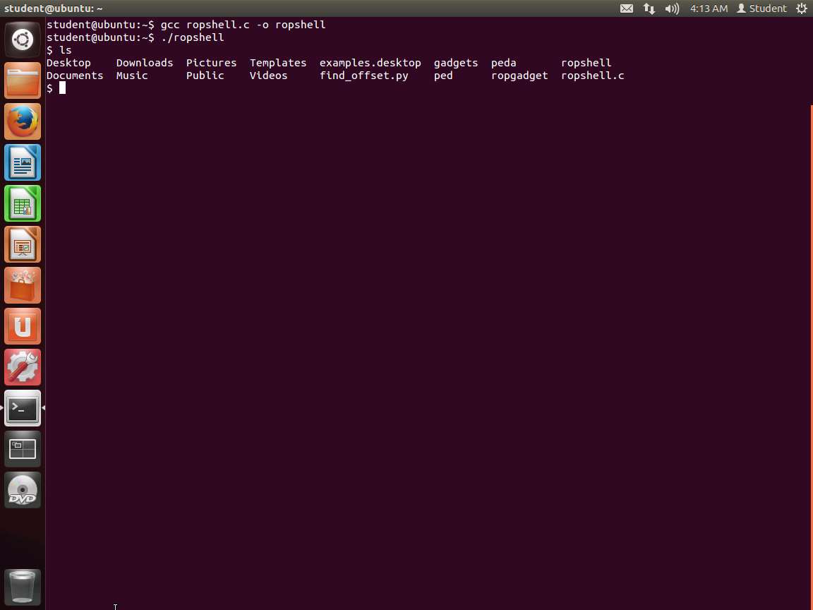 Next, save the file as ropshell.c. Then compile it, and you should get a shell as shown in the following screenshot.