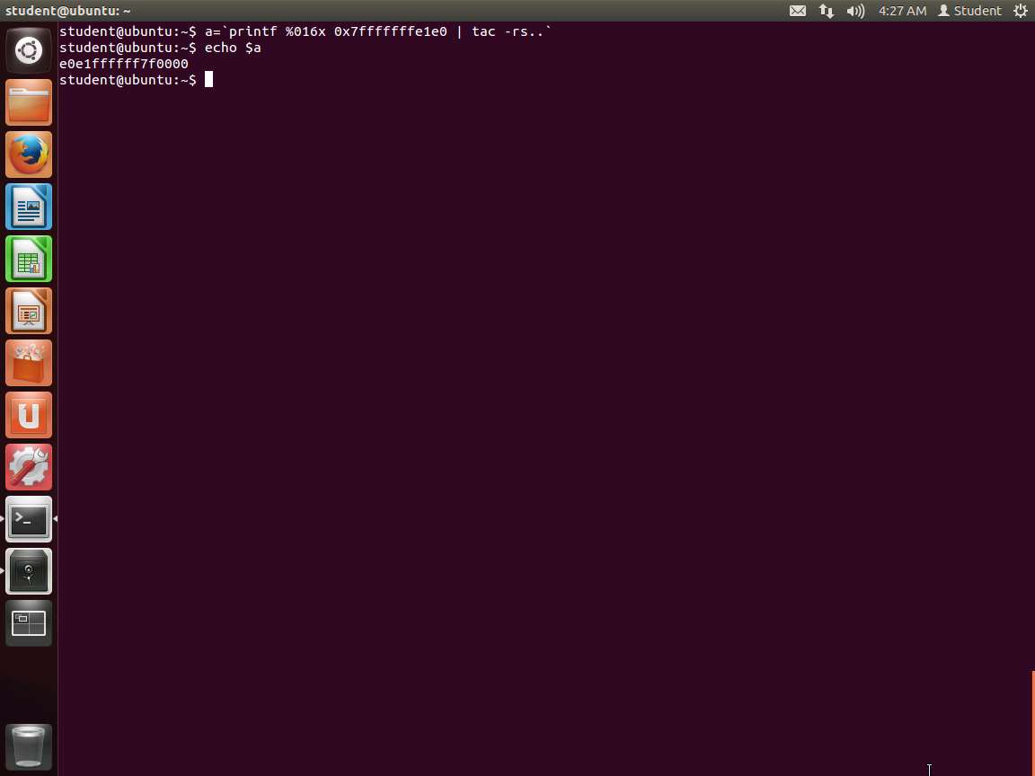 Enter a='printf %016x 0x7fffffffe1e0 | tac -rs..' Then enter echo $a. An example of this output, which shows the address in the little-endian format, is shown in the following screenshot.