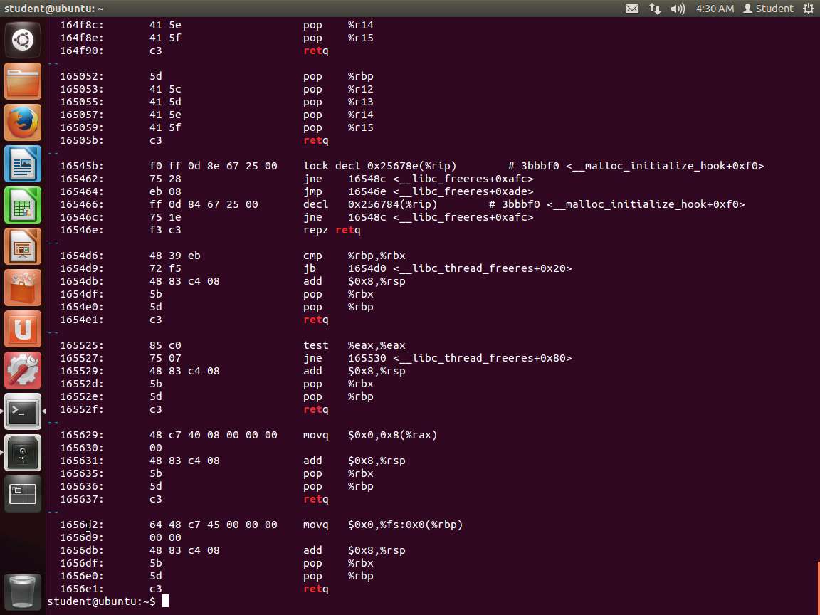 Enter the following: objdump -d /lib/x86_64-linux-gnu/libc.so.6 | grep -B5 ret. An example of the command output is shown in the following screenshot.