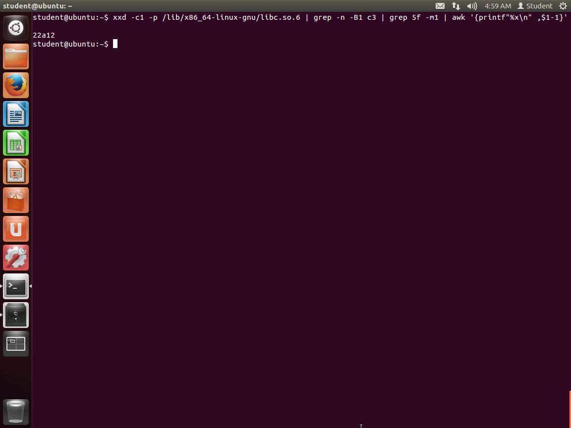 We could go through this long output, but that is not a great solution. You cannot search for a sequence of bytes; at least at the time of writing this lab, there was no easy way to do this. So, using the workaround from the crypto team at Stanford, enter xxd -c1 -p /lib/x86_64-linux-gnu/libc.so.6 | grep -n -B1 c3 | grep 5f -m1 | awk '{printf"%x\n",$1-1}'